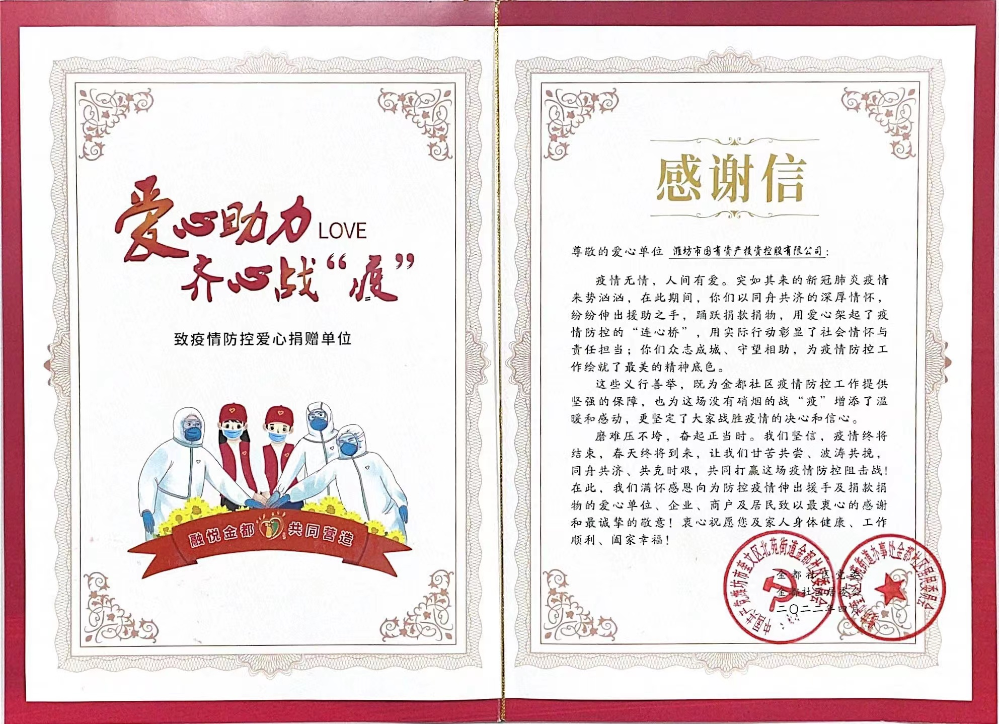 5月7日,市國(guó)投公司收到了一封來(lái)自金都社區(qū)的感謝信,信中對(duì)市國(guó)投公司第一時(shí)間馳援社區(qū)疫情防控工作,積極協(xié)調(diào)捐贈(zèng)抗疫物資等志愿行動(dòng)表達(dá)了衷心的感謝。截至目前,公司向社區(qū)捐贈(zèng)醫(yī)用口罩、酒精、醫(yī)用手套、方便面等抗疫物資價(jià)值6000余元,前后5次通過(guò)電聯(lián)、...