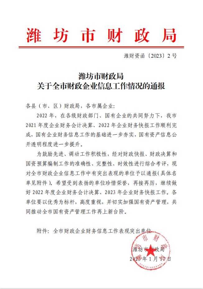 近日,濰坊市財(cái)政局下發(fā)文件,對(duì)全市財(cái)政企業(yè)信息工作情況進(jìn)行通報(bào),我公司榜上有名,連續(xù)兩年被評(píng)為“全市財(cái)政企業(yè)財(cái)務(wù)信息工作表現(xiàn)突出單位”。公司歷來(lái)高度重視財(cái)務(wù)管理工作。2022年度一把手親自抓靠,通過(guò)會(huì)計(jì)工作數(shù)字化轉(zhuǎn)型、人才隊(duì)伍結(jié)構(gòu)優(yōu)化、會(huì)計(jì)職能